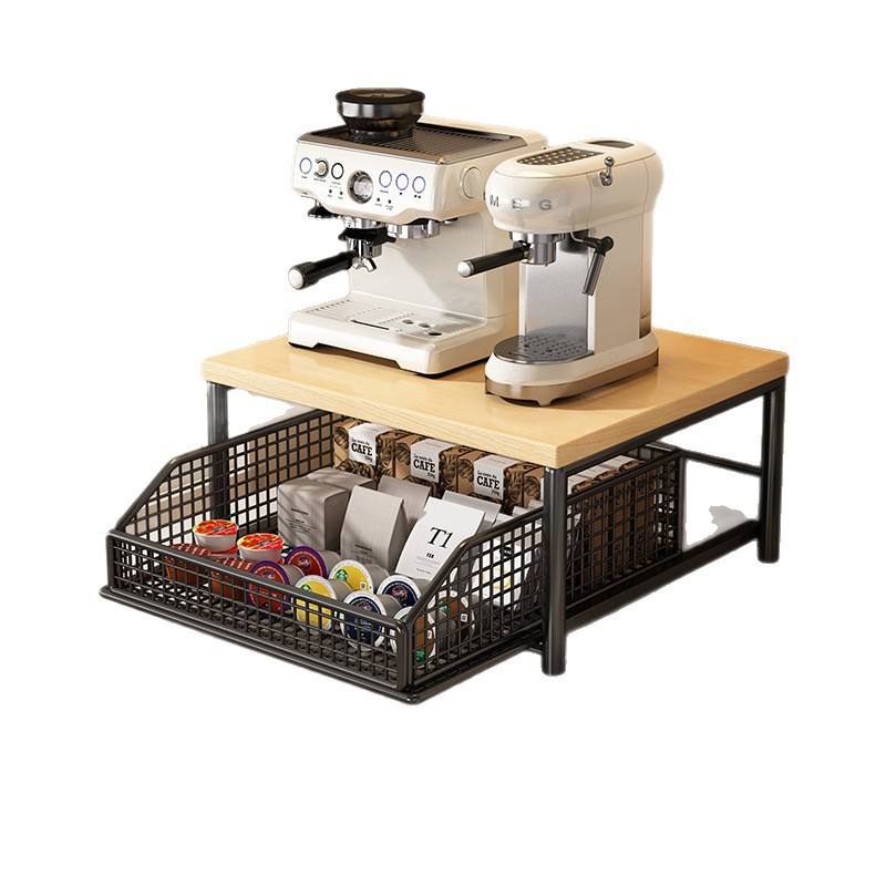ชั้นวางของในครัวทันสมัยพร้อมท็อปไม้และตะกร้าสำหรับจัดเก็บเครื่องชงกาแฟ ถุงชา ขนม และของหวาน