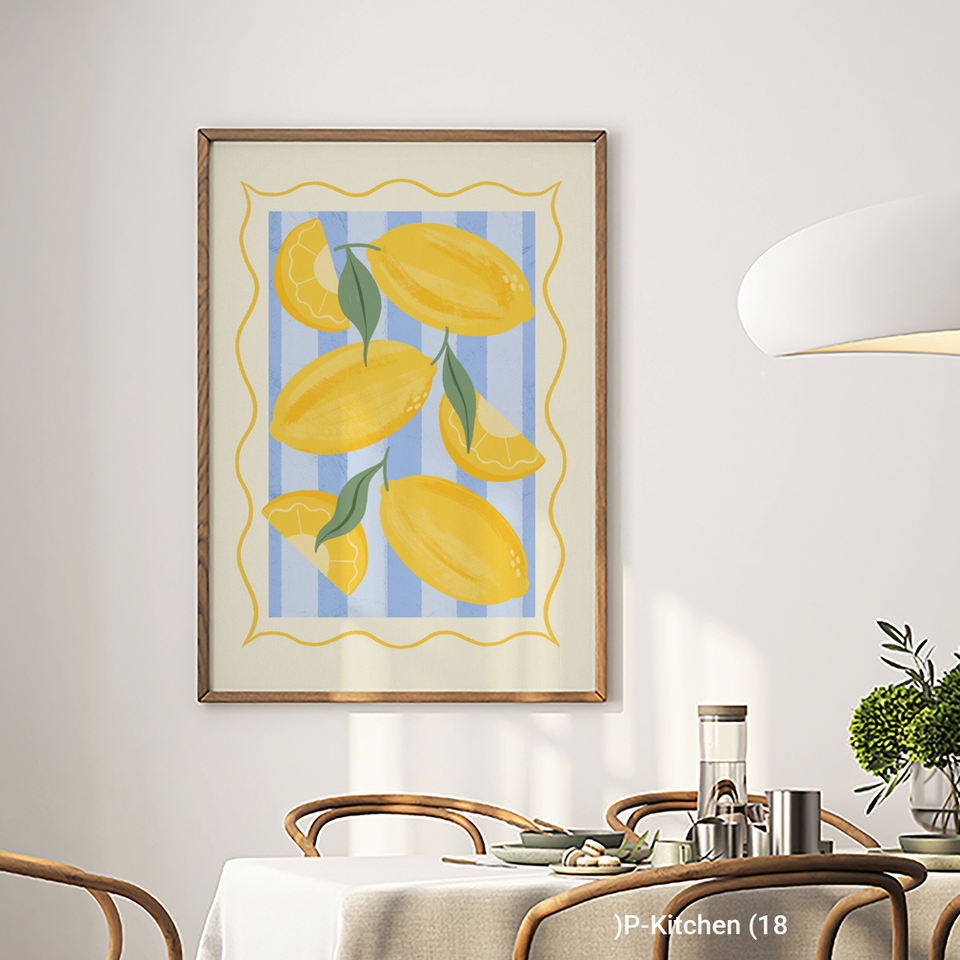 ภาพศิลปะติดผนังห้องครัวสมัยใหม่ ลายมะนาวนามธรรม พื้นหลังสีชมพูพาสเทล ภาพผลไม้สีน้ำบนผืนผ้าใบ ตกแต่งห้องรับประทานอาหารให้มีชีวิตชีวา