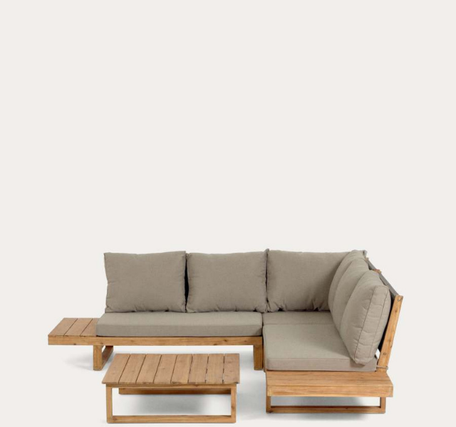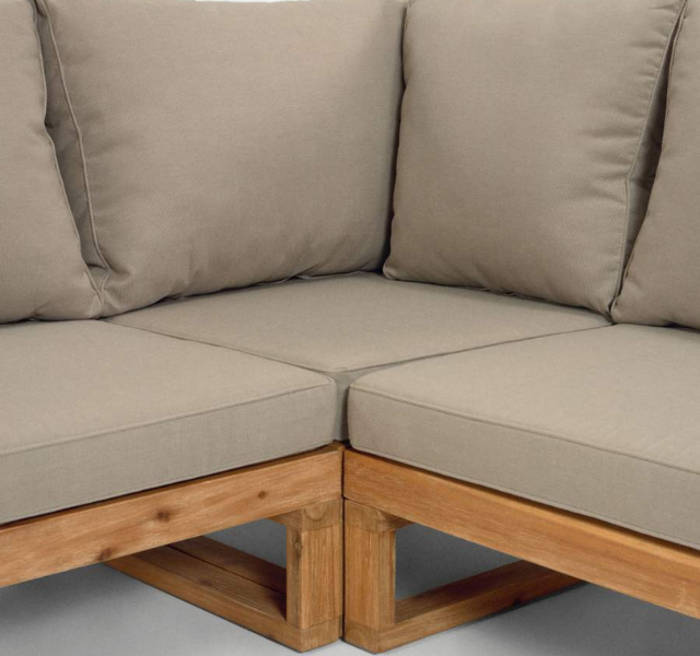 ชุดโซฟาไม้สักทรงตัวแอลทันสมัยสำหรับสวนกลางแจ้ง พร้อมโต๊ะกาแฟ เบาะรองนั่ง เหมาะสำหรับวิลล่า รีสอร์ท ลานบ้าน ระเบียงหรูหรา