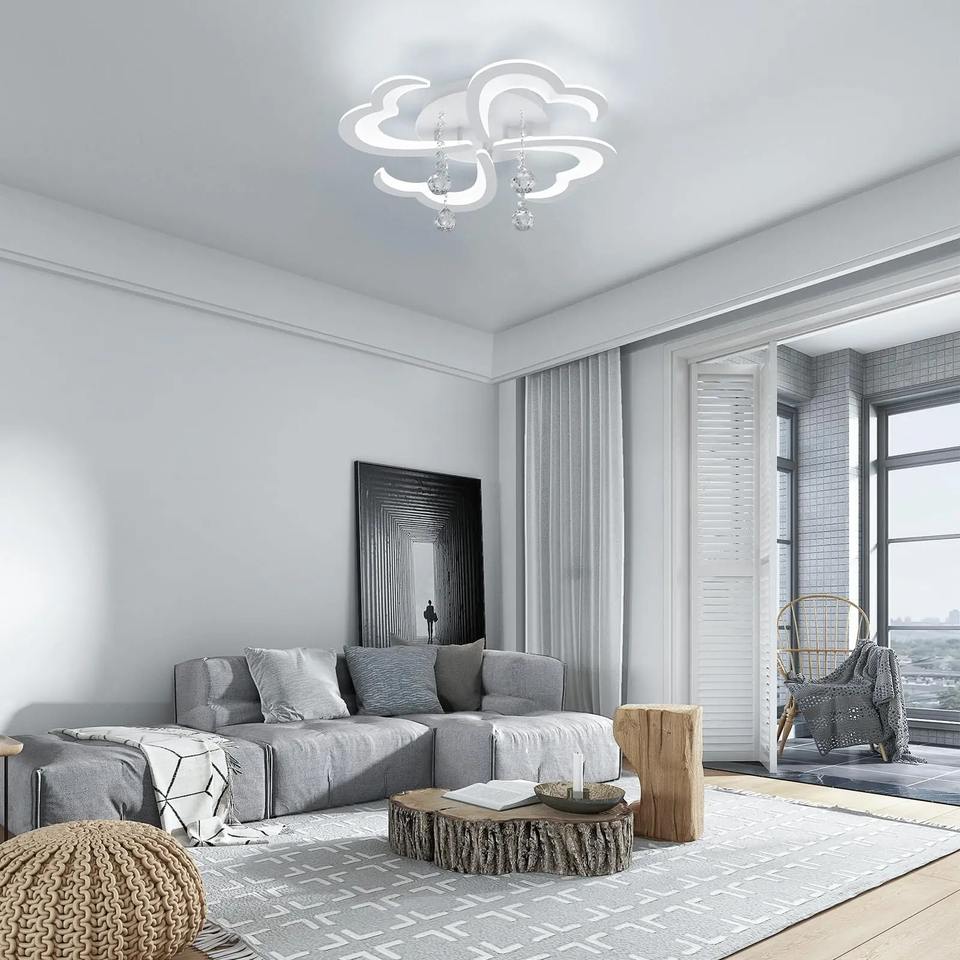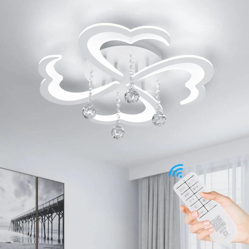 โคมไฟเพดาน LED โมเดิร์น แบบสี่หัวรูปดอกไม้ พร้อมคริสตัล ควบคุมด้วยรีโมท สำหรับตกแต่งภายในบ้าน