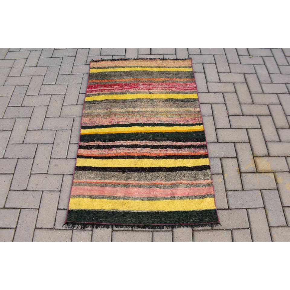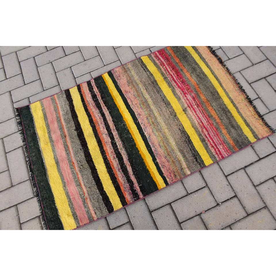 พรมขนสัตว์ตุรกีลายทางสีเหลืองขนาด2.6x4ฟุตแบบสี่เหลี่ยมผืนผ้าดีไซน์การเย็บปะติดปะต่อกันสำหรับห้องนั่งเล่นห้องโถงทางเดินลาเท็กซ์