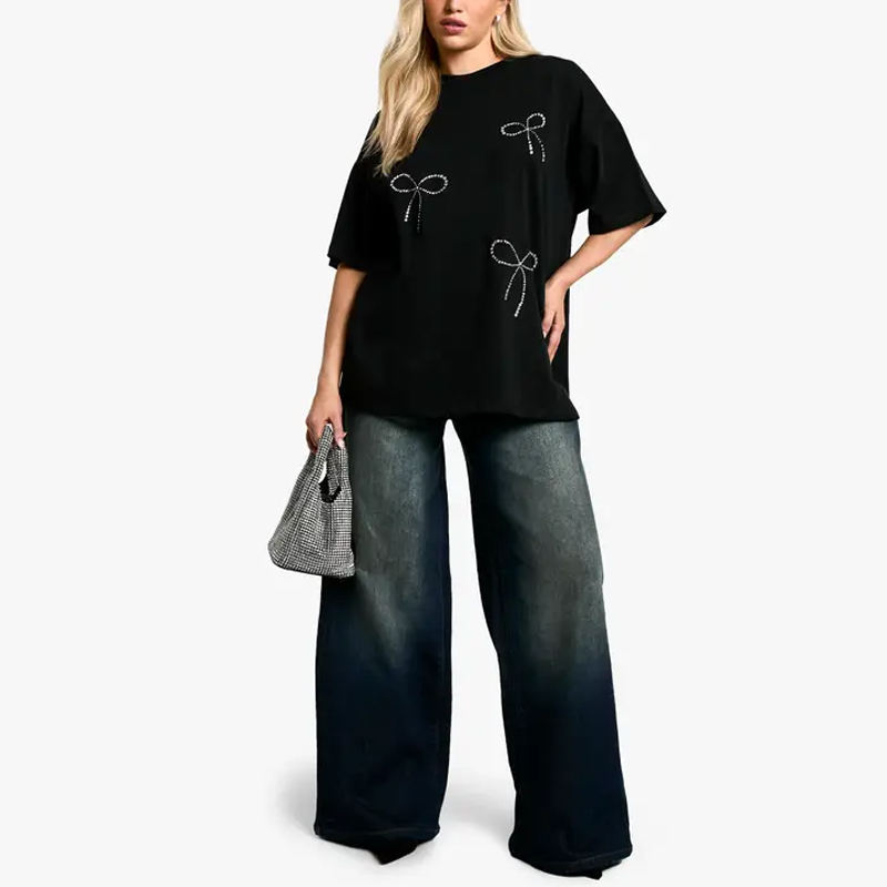 เสื้อยืดโอเวอร์ไซส์คอกลมสไตล์ลำลองสำหรับฤดูร้อน ดีไซน์โบว์ติดด้วยเทคนิค Hotfix คุณภาพสูง ผลิตตามสั่ง รุ่นใหม่ล่าสุด สำหรับผู้หญิง