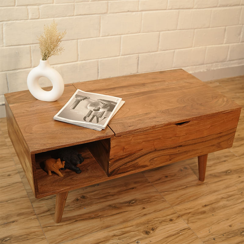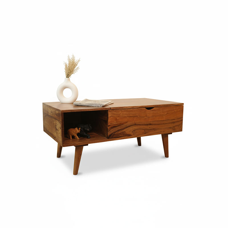 โต๊ะกลางไม้สักแท้แบบยกได้ทันสมัย สำหรับวางแล็ปท็อปและอ่านหนังสือ พร้อมที่เก็บของและชั้นวางด้านข้าง โต๊ะห้องนั่งเล่น Woodensure