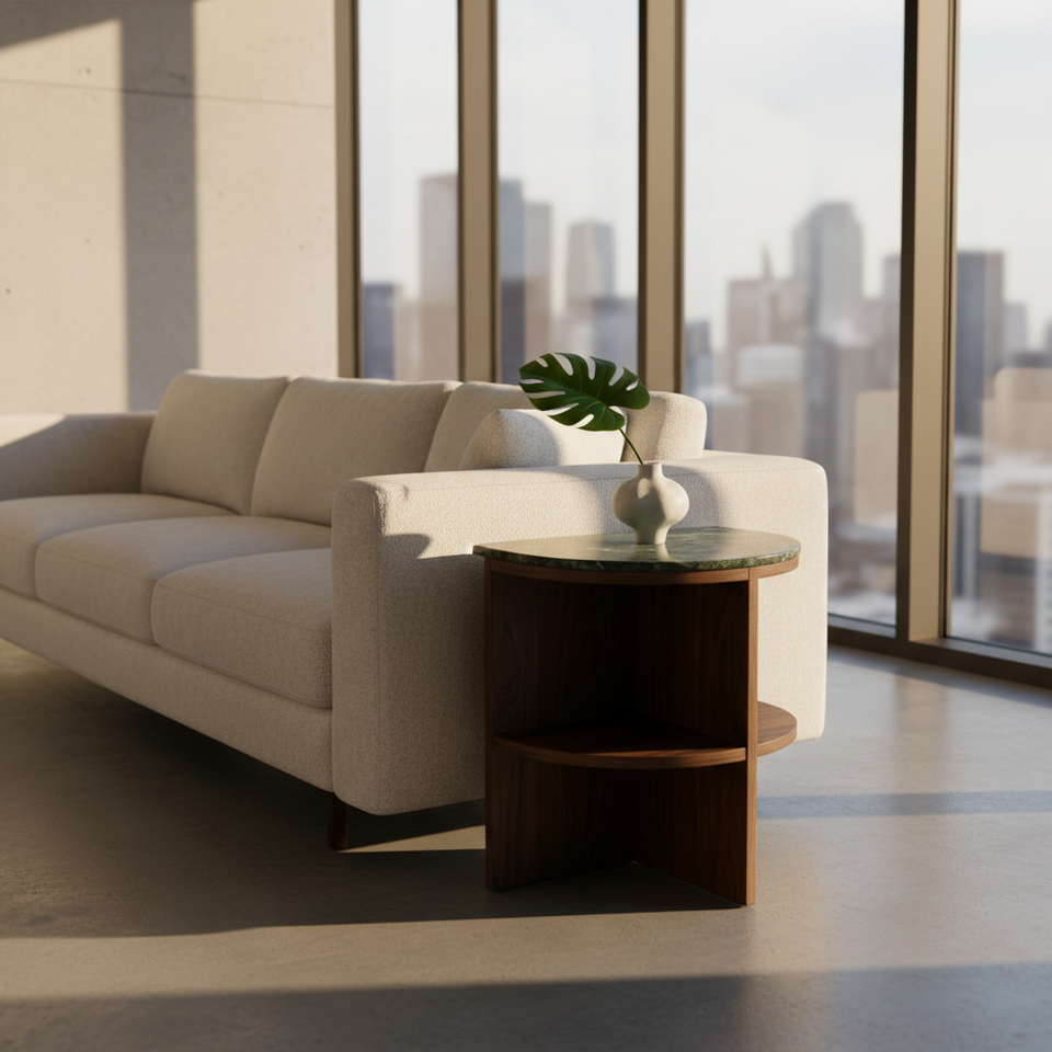 โต๊ะข้างเตียงและห้องนั่งเล่นสไตล์โมเดิร์น ผลิตจากไม้ยางพาราเป็นมิตรกับสิ่งแวดล้อมจากเวียดนาม หน้าโต๊ะวีเนียร์ MDF ลายหินอ่อน รับประกัน 1 ปี