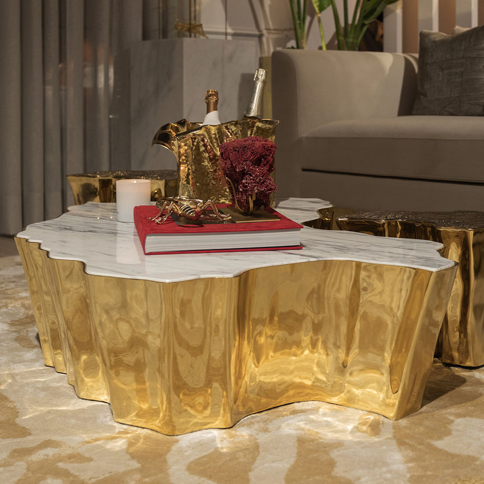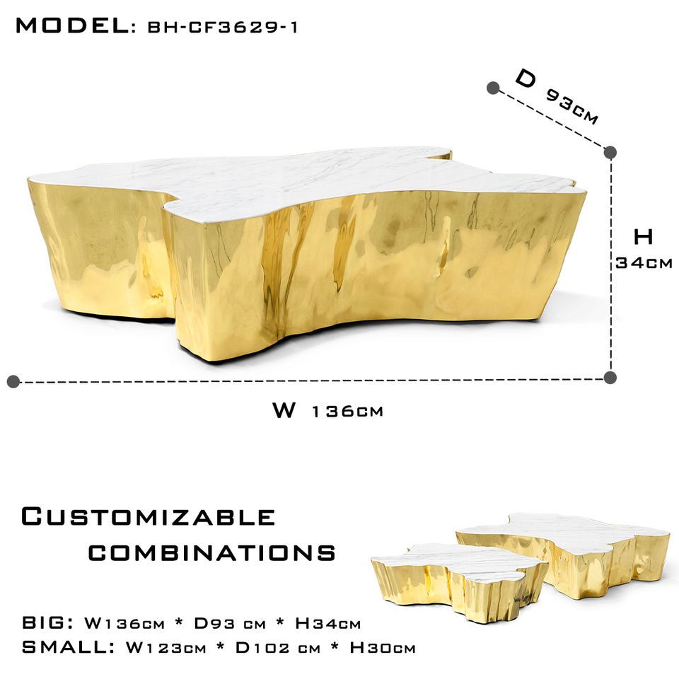 โต๊ะกาแฟในบ้านสุดหรูทันสมัยท็อปหินอ่อนธรรมชาติพร้อมโลหะเคลือบสำหรับห้องนั่งเล่นเฟอร์นิเจอร์ภายในบ้าน