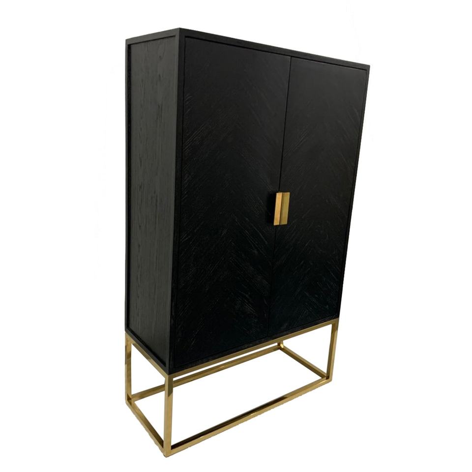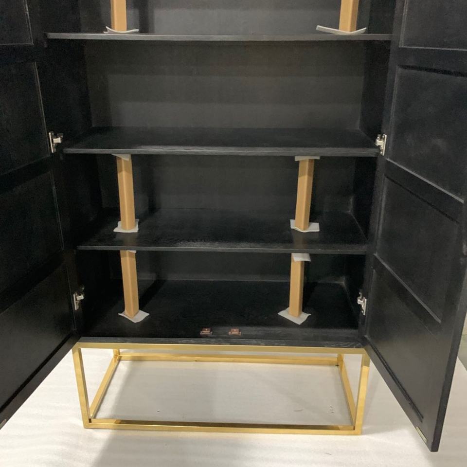 ตู้เก็บของห้องนั่งเล่นทันสมัย สีดำทองเหลือง โครงเหล็ก ผนังไม้ พร้อมบานประตู 2 บาน