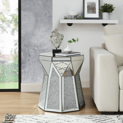 Modern Luxury 20 Inch Silver Drum Style Coffee Table with Mirror Crystal Inlay Polygonal Design for Living Room FCJ Furniture