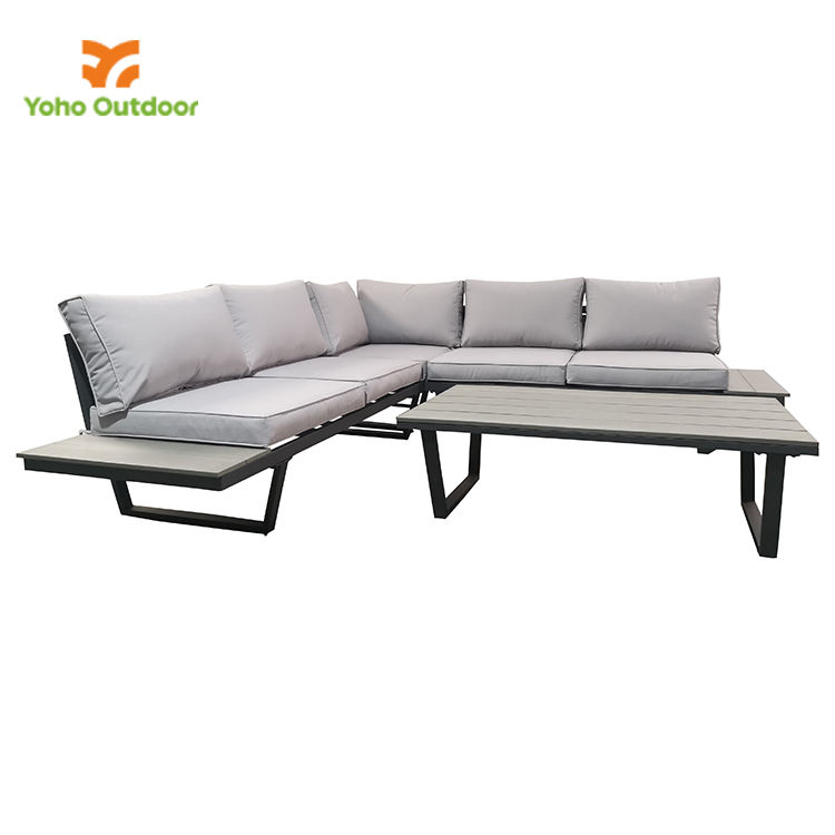 ชุดโซฟาเข้ามุมทำจากอลูมิเนียมทำจากไม้พลาสติกเฟอร์นิเจอร์กลางแจ้งสำหรับใช้ในสวนลานภายในโรงแรมหรูหราทันสมัย