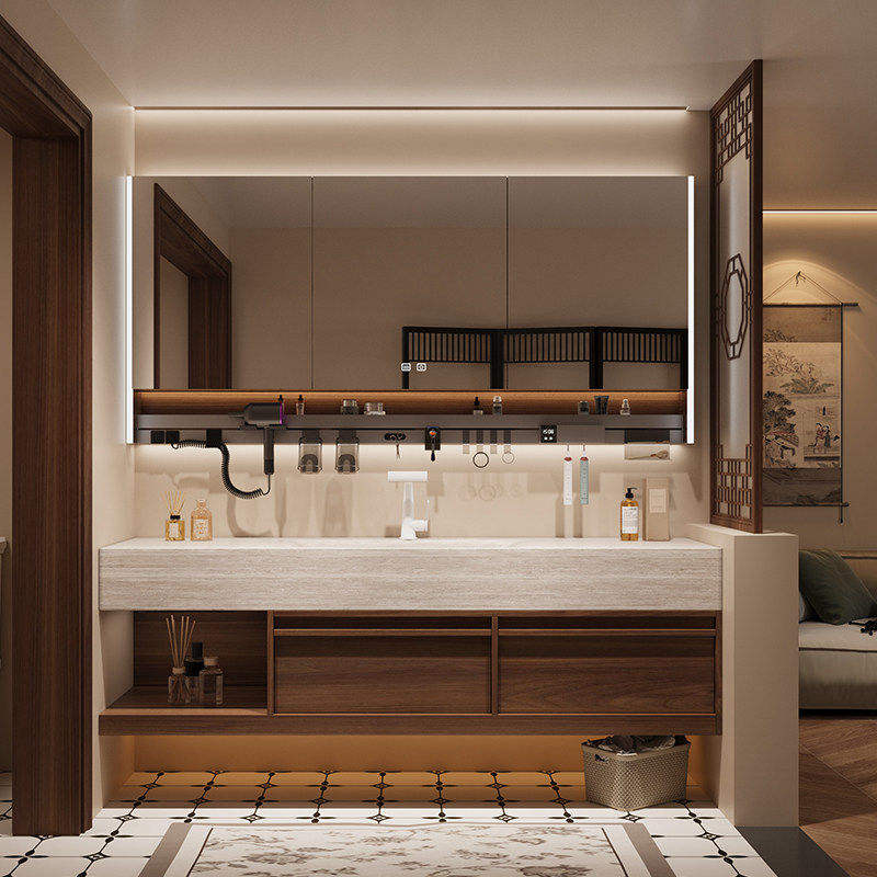 ตู้ห้องน้ำหรูหราทันสมัยพร้อมท็อปเคาน์เตอร์หินอ่อนแบบแผ่นเดียว กระจกอัจฉริยะป้องกันฝ้า เคลือบเงา เหมาะสำหรับใช้ในโรงพยาบาล