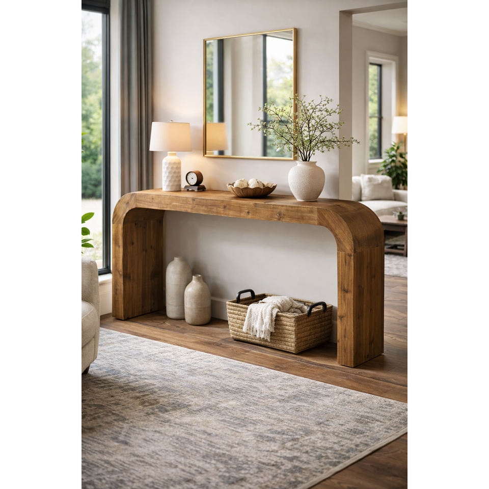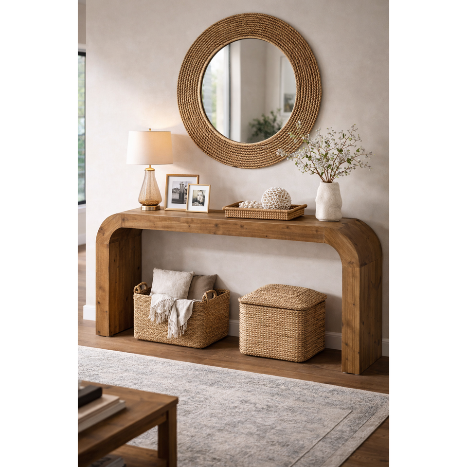 โต๊ะคอนโซลหรูหราทันสมัย 70.9 นิ้ว สไตล์ฟาร์มเฮาส์ ทำจากไม้โอ๊คแท้ สำหรับทางเข้าบ้าน ปรับเปลี่ยนรูปแบบได้ มุมโค้งมน พร้อมกระจกตกแต่ง