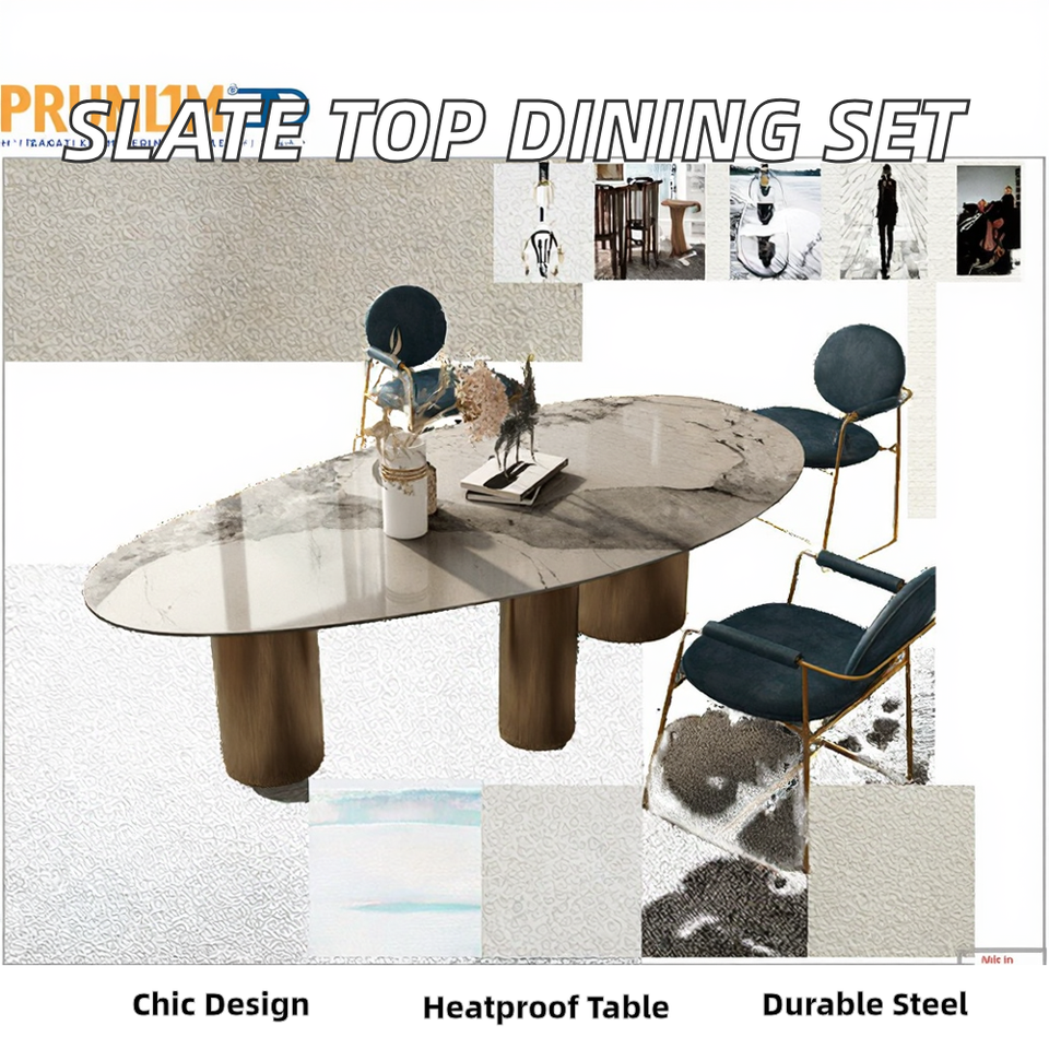 ชุดโต๊ะอาหารหรูหราทันสมัย โครงสแตนเลสสีอ่อน ท็อปหินชนวน สำหรับอพาร์ทเมนต์ โรงแรม ใช้กลางแจ้ง ทนความร้อน 8 ชิ้น เฟอร์นิเจอร์สำหรับบ้าน
