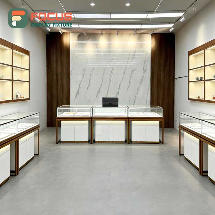 ตู้โชว์กระจกหรูหราทันสมัย โครงสร้างโลหะสำหรับโชว์เครื่องประดับ พร้อมเคาน์เตอร์ไม้ สำหรับร้านค้าปลีก
