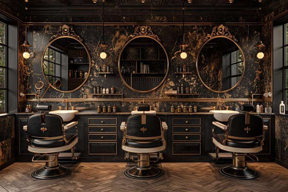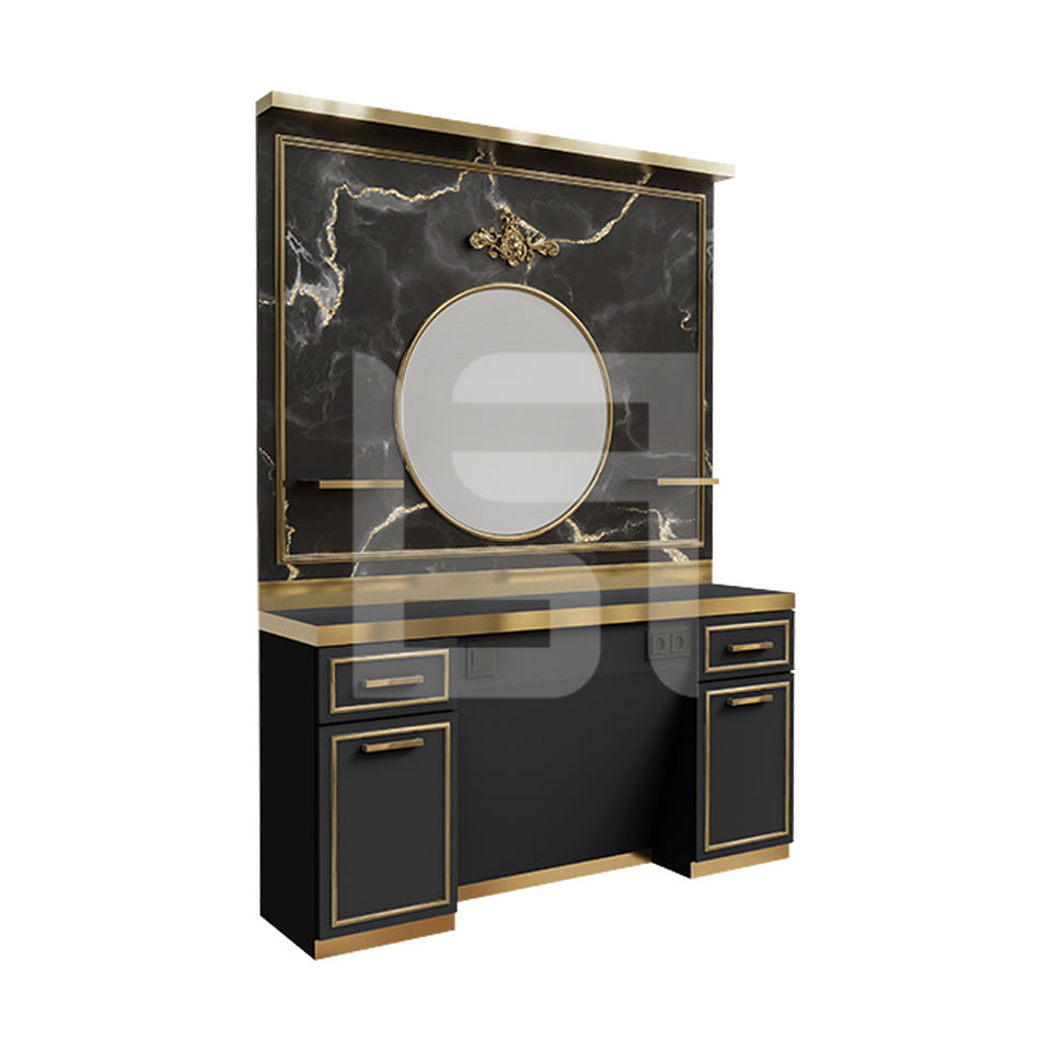 สถานีตัดผมเชิงพาณิชย์ไม้สีทองและสีดำสุดหรูทันสมัยสำหรับร้านตัดผม เฟอร์นิเจอร์ร้านเสริมสวยสไตล์ใหม่