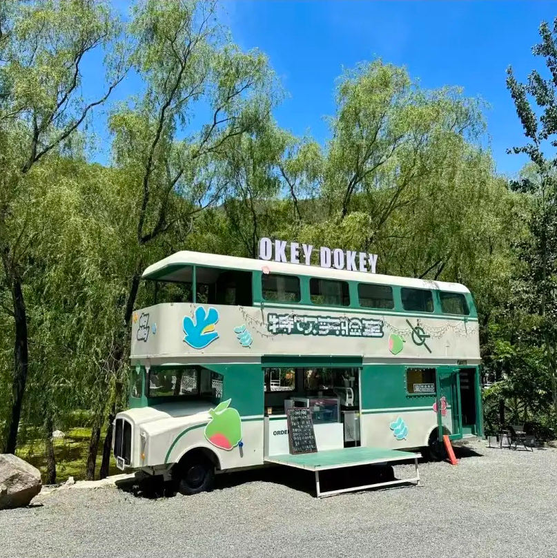 รถขายอาหารแบบสองชั้นสีเขียวหรูหราทันสมัยรถขายอาหารไอศครีมรถบัสสองชั้นรถขายอาหารเคลื่อนที่ได้พร้อมห้องครัวเต็มรูปแบบ