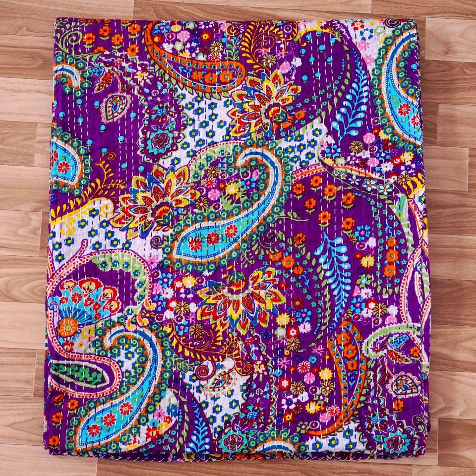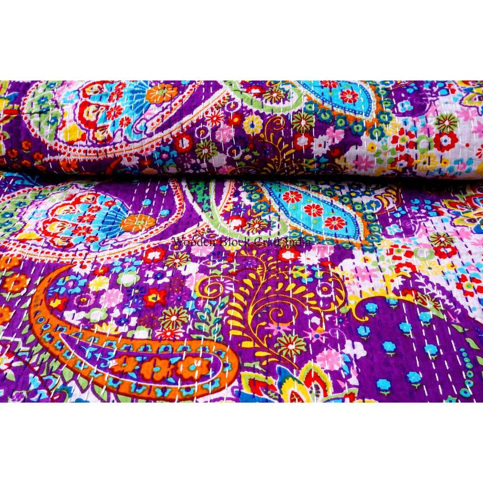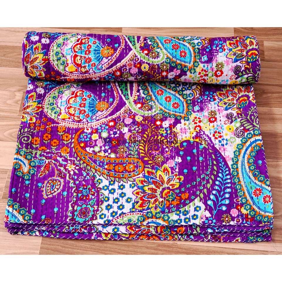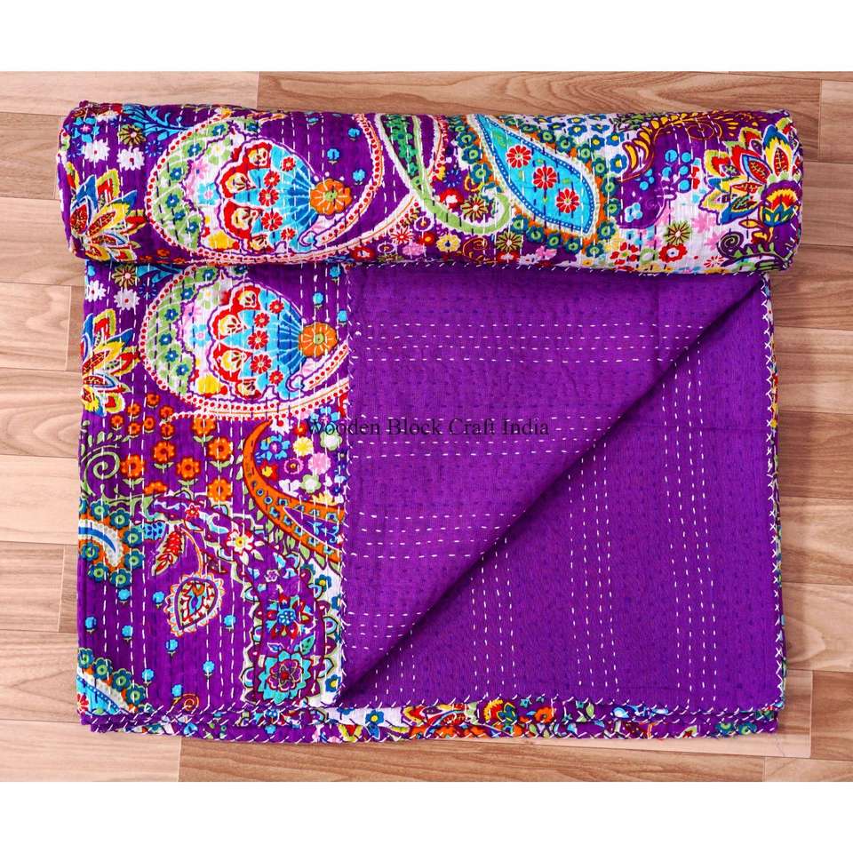 ผ้านวมควีนไซส์ลายปักมือแบบคันธา พิมพ์ลายบล็อก ดีไซน์แพทช์เวิร์ค ผ้าฝ้ายออร์แกนิค 100% สำหรับใช้ในบ้าน เป็นมิตรกับสิ่งแวดล้อม