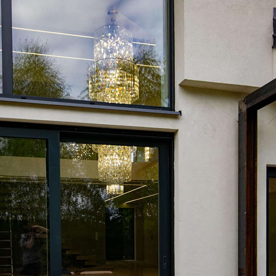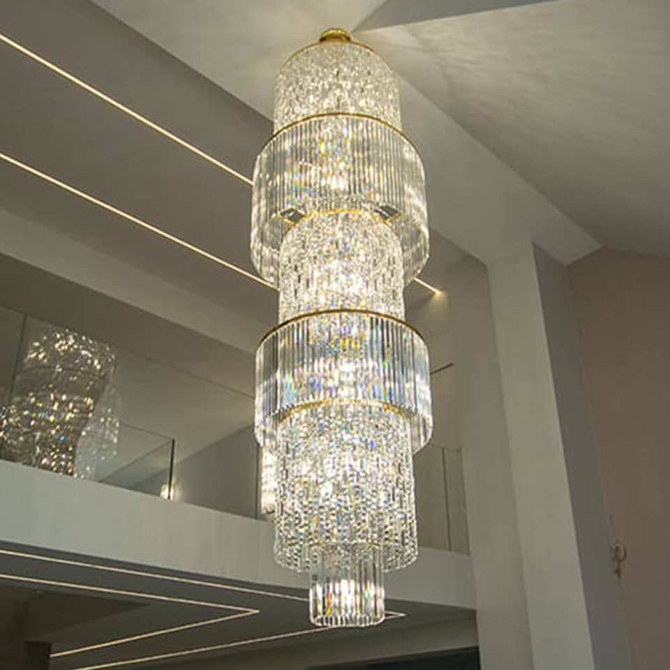 จี้คริสตัลห้อยเพดานสูงทำจากสแตนเลส K9หรูหราทันสมัยสำหรับโรงแรมล็อบบี้โคมไฟระย้าบันได