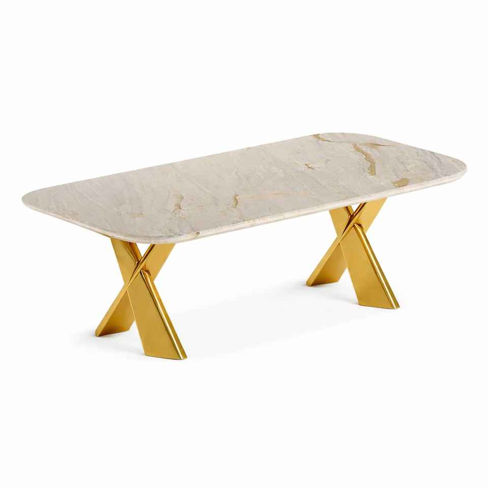 โต๊ะรับประทานอาหารหินอ่อนหรูหราสไตล์โมเดิร์นมินิมอล ขาเหล็กทรง X สีทอง เฟอร์นิเจอร์ดีไซน์สำหรับโรงแรมกลางแจ้ง