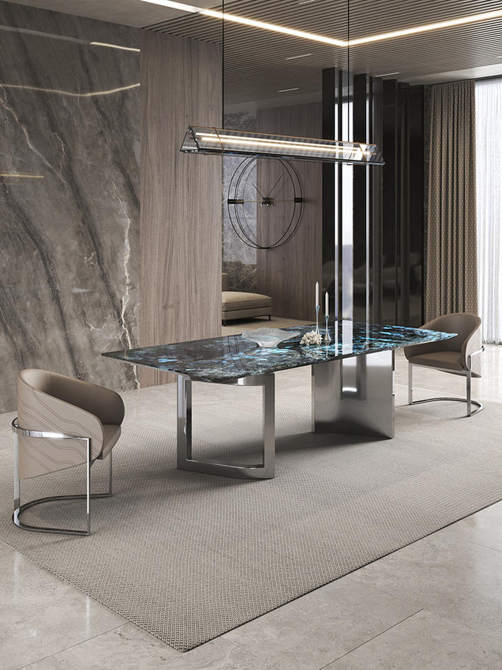 โต๊ะรับประทานอาหารทรงสี่เหลี่ยมทันสมัยฐานสแตนเลสพร้อมหินหินอ่อนหินแกรนิตสีฟ้าหรูหราเฟอร์นิเจอร์ห้องรับประทานอาหารสุดหรู