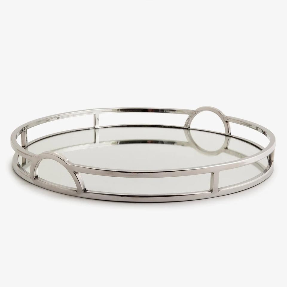ถาดกระจกกลมหรูหราทันสมัยพร้อมกรอบโลหะสีเงินเงาสำหรับห้องนั่งเล่นการแสดงเครื่องประดับงานแต่งงานหรือของขวัญ