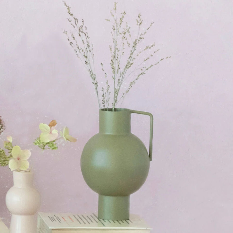 แจกันเซรามิกสีเขียวด้านทันสมัยพร้อมหูจับ แจกันดอกไม้สไตล์มินิมอลสำหรับบ้าน โรงแรม ร้านอาหาร โต๊ะอาหาร ขายส่ง