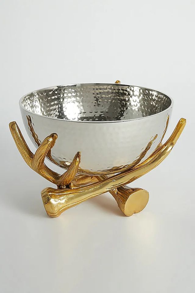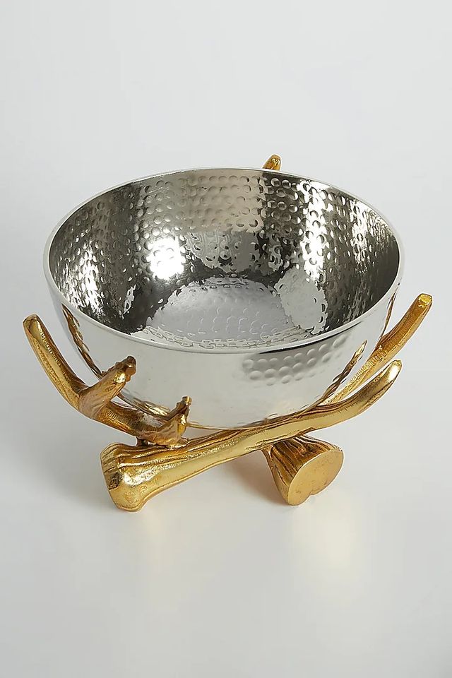 ชามผลไม้โลหะทันสมัย สีเงินตอกลาย พร้อมงานตกแต่งลายแฟนซี รูปทรงกลม พร้อมขาตั้งโลหะสีทอง ของตกแต่งบ้านสไตล์โมเดิร์น