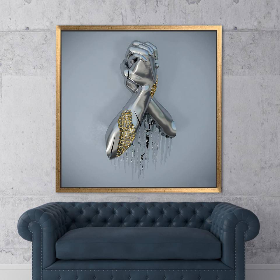ผ้าใบศิลปะด้วยมือแบบโลหะที่ทันสมัย-งานศิลปะสีเงินพิมพ์ลายกรอบสีทอง