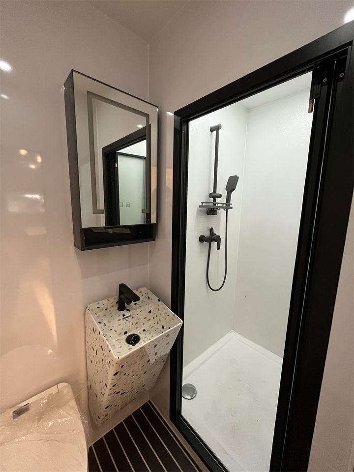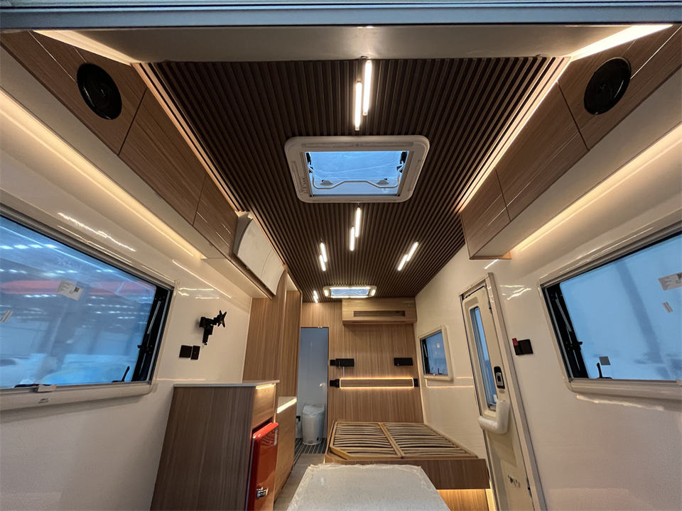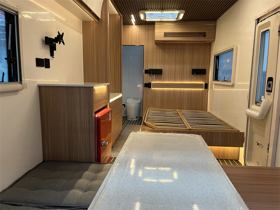 คาราวานขนาดเล็กที่ทันสมัยสำหรับการตั้งแคมป์ห้องโดยสารกันน้ำสำหรับรีสอร์ทตั้งแคมป์หรือที่อยู่อาศัยที่ดินส่วนตัวพร้อมพื้นไวนิล