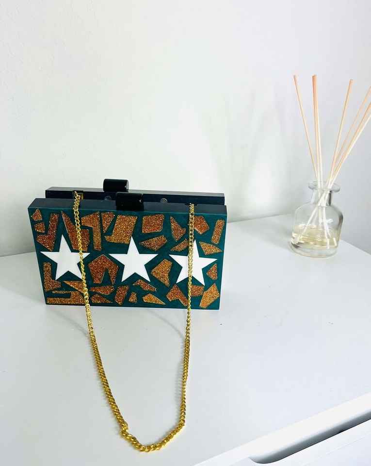 กระเป๋าถือคลัทช์เรซิ่นขนาดเล็กที่ทันสมัยพร้อมที่ปิดซิปและการตกแต่งเพชรสำหรับงานปาร์ตี้ที่บ้านหรืองานแต่งงานจากอินเดีย