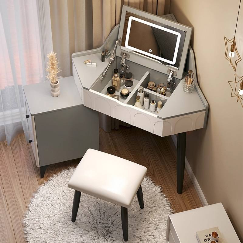 โต๊ะเครื่องแป้งมุมสไตล์มินิมอลทันสมัยพร้อมที่เก็บของสำหรับห้องนอนผู้หญิง