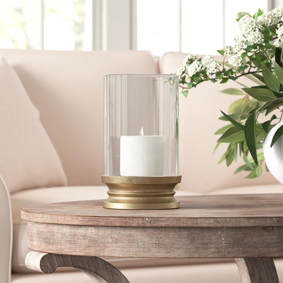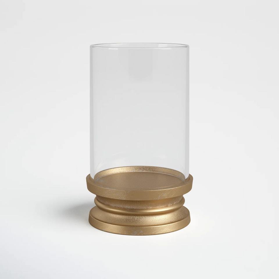 เชิงเทียนทรงพายุเฮอริเคนสไตล์โมเดิร์นมินิมอล ฐานสีทองขัดเงา ภาชนะแก้วโค้ง ดีไซน์หรูหรา น้ำหนักมาก สีทองเหลือง เหมาะสำหรับเทศกาลคริสต์มาส