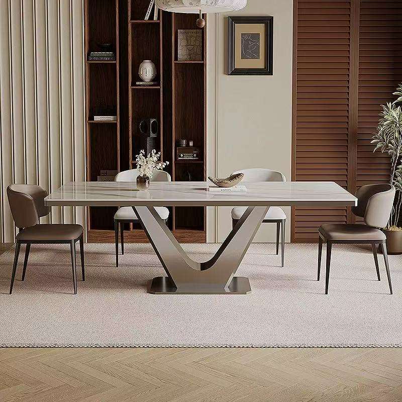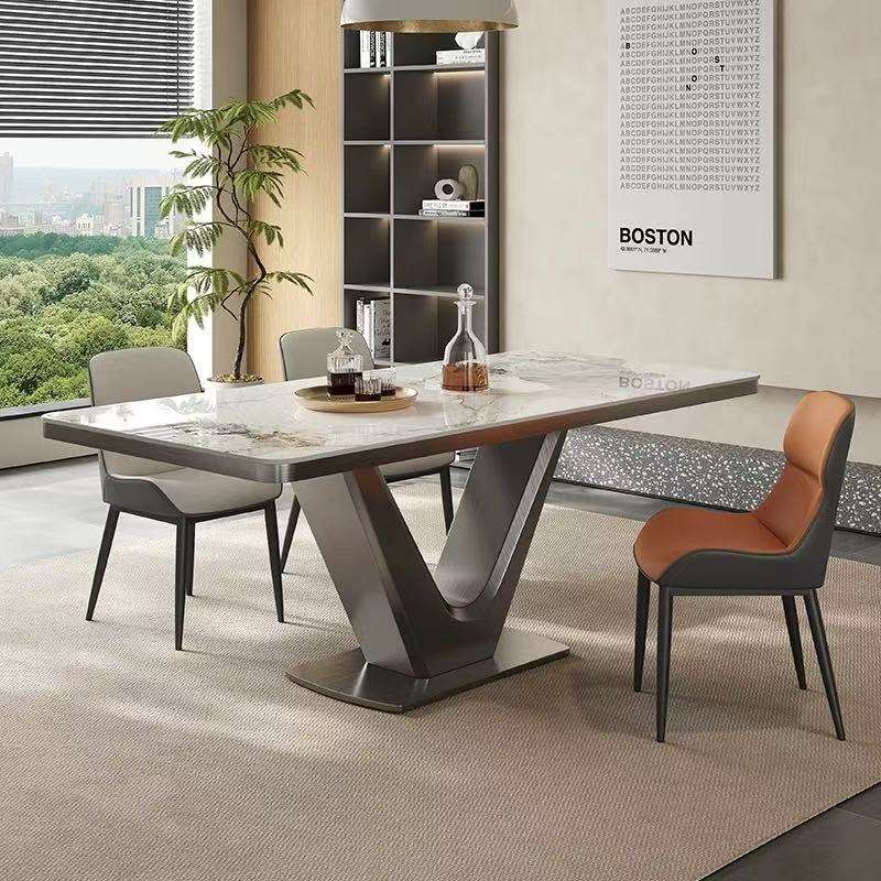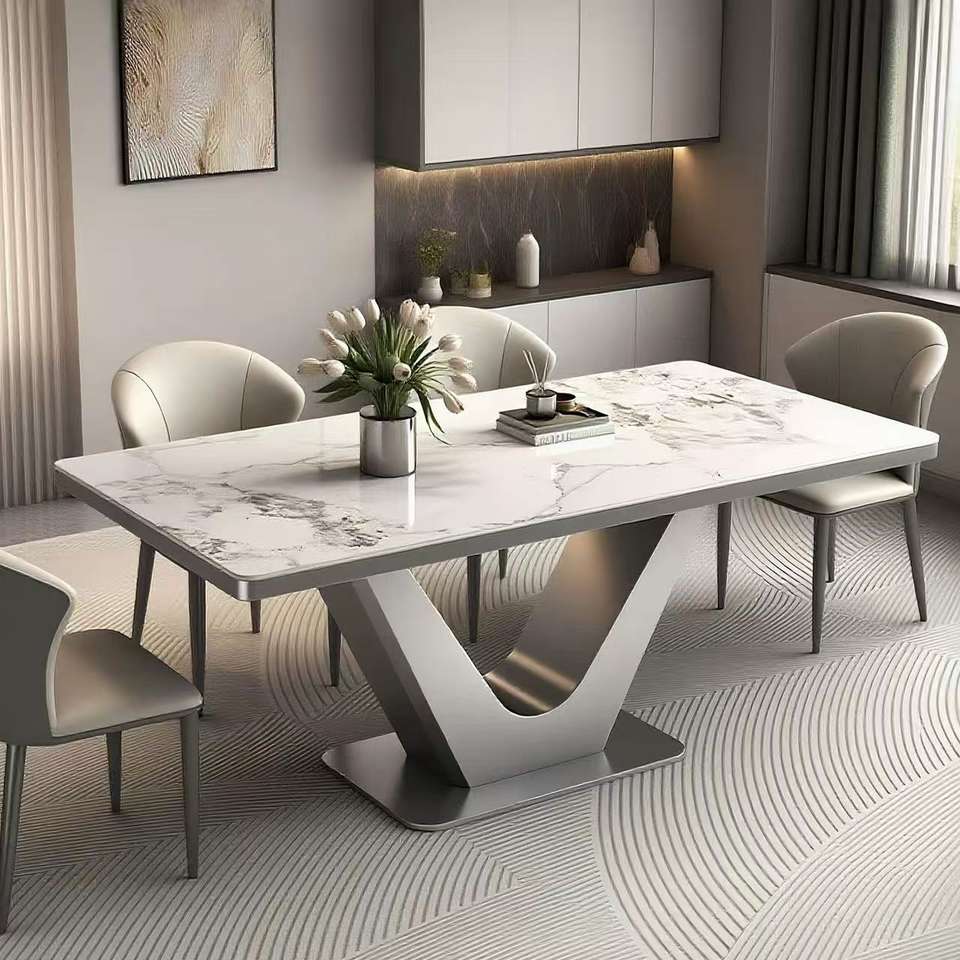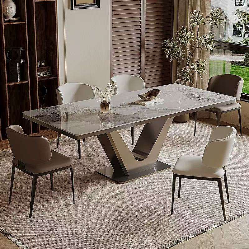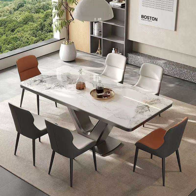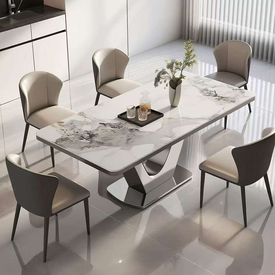 โต๊ะอาหารทรงสี่เหลี่ยมผืนผ้าสไตล์โมเดิร์นมินิมอล พร้อมท็อปหิน ดีไซน์เรียบหรู เหมาะสำหรับครอบครัวขนาดเล็ก รวมเก้าอี้