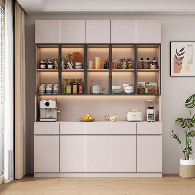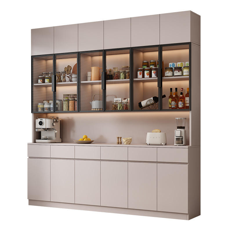 ตู้ข้างผนังสไตล์โมเดิร์นมินิมอลสำหรับห้องนั่งเล่น พร้อมบานกระจกและไฟส่องสว่าง สำหรับจัดเก็บในครัว