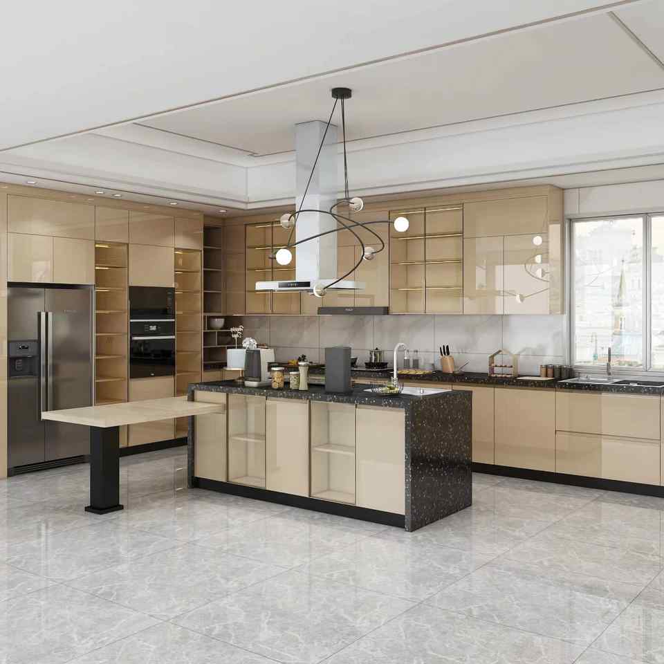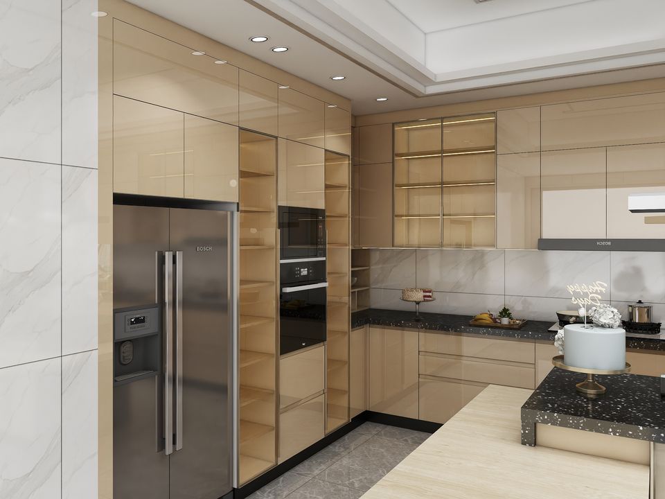 ตู้ครัวโมเดิร์นแบบโมดูลาร์ ไฮกลอส ประตูกระจกสีน้ำตาลหรูหรา โครงสร้างไม้อัด ดีไซน์กันน้ำ พร้อมแผ่นกันเปื้อน