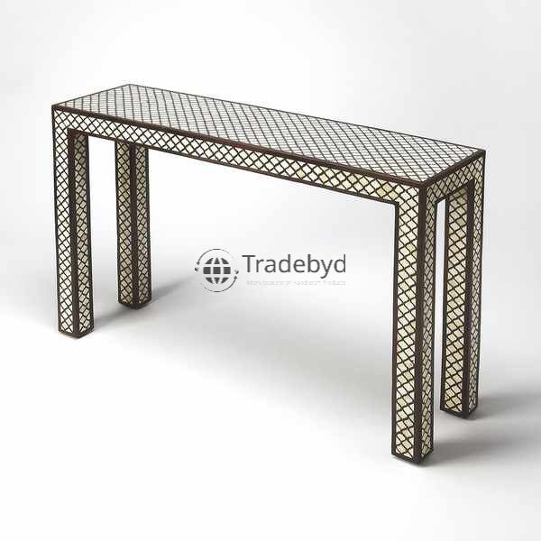 โต๊ะคอนโซลฝังลายดอกไม้สีขาวดำแบบทันสมัยพร้อมกรอบไม้สำหรับการตกแต่งภายในที่หรูหราเหนือกาลเวลาในอพาร์ทเมนต์โรงเรียน