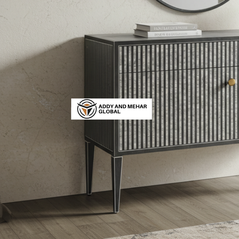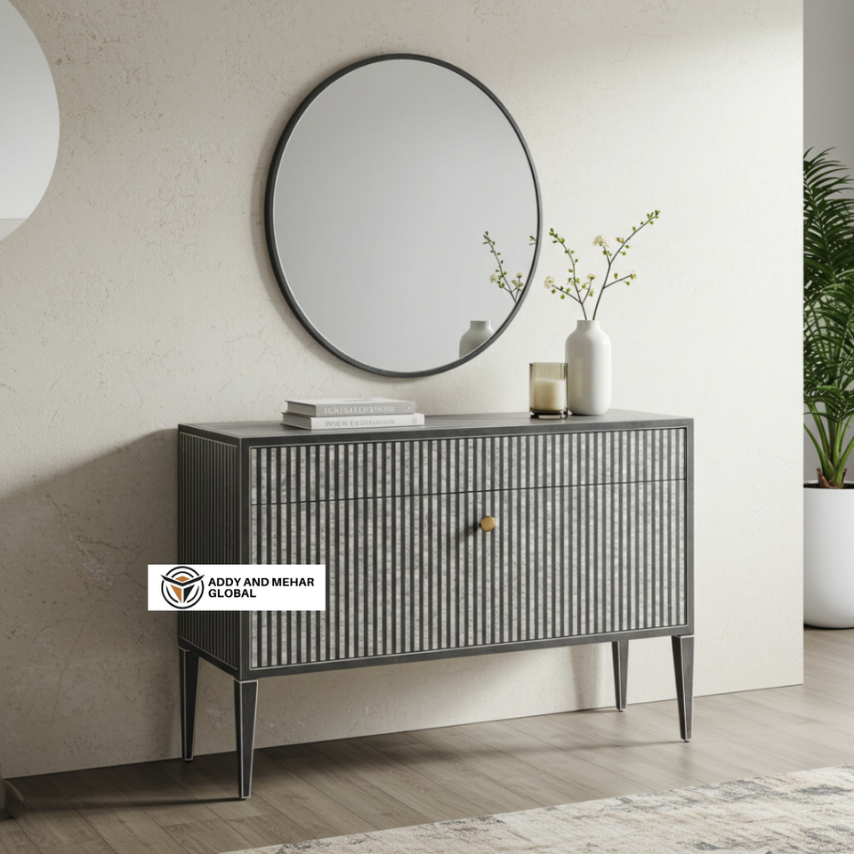 ตู้เก็บของลายมุกแบบโมเดิร์นรักษ์โลก งานแฮนด์เมดลายทาง พร้อมลูกบิดทองเหลือง สำหรับห้องนั่งเล่น