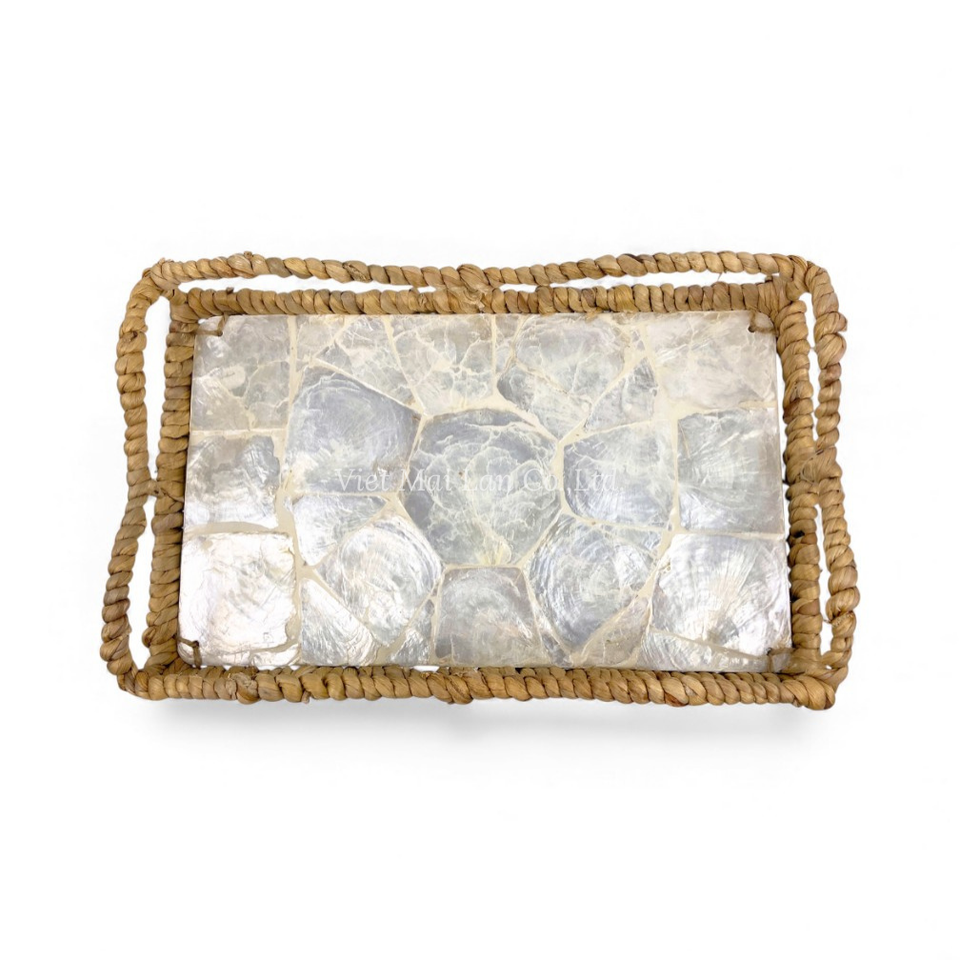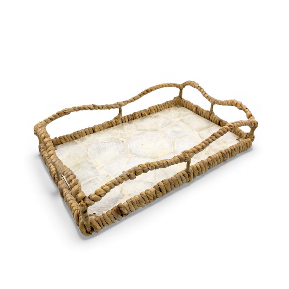 Modern Bohemian Mother of Pearl Tray with Flexible Design Water Hyacinth Edge for Home Table Display Food Serving From Vietnam