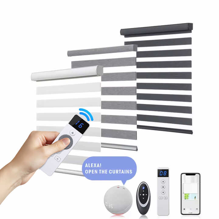 ม่านม้วนแบบมอเตอร์ทันสมัย ม่านเวเนเชียนแบบใบกว้าง หลายสี ม่านม้วนแนวตั้งแบบซีบร้า สำหรับห้องนั่งเล่น