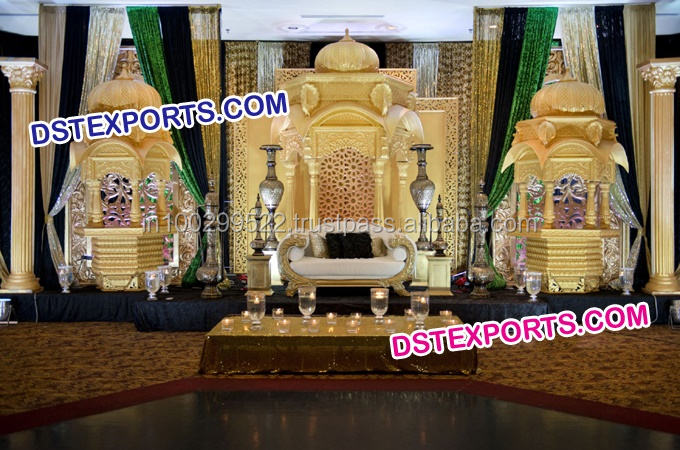 ชุดรูปแบบการรับงานแต่งงานทันสมัยของ Mughal แผงฉากหลังดอกไม้ที่สวยงามเสาไฟเบอร์กลาสแกะสลักสีทองสำหรับงานแต่งงาน