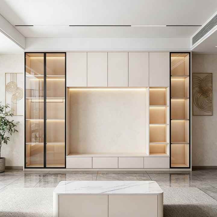 ตู้วางทีวีติดผนังอเนกประสงค์ทันสมัย พร้อมชั้นวางหนังสือกระจก สำหรับห้องนั่งเล่นในบ้าน