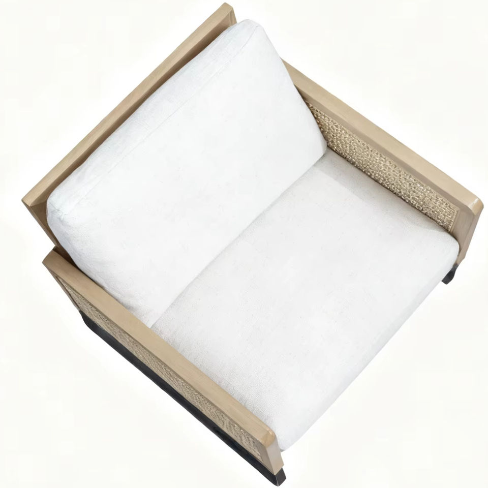 upholstered cushions, Solid wood frame with natural rattan panels, powder-coated metal base, luxurious and durable designลักษณะ