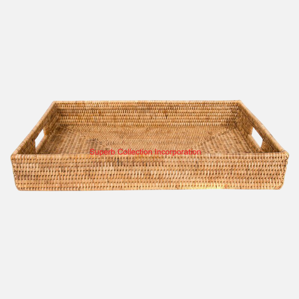 ถาดรองเสิร์ฟหวายทรงกลมพร้อมที่จับถาดเป็นมิตรกับสิ่งแวดล้อมสำหรับตกแต่งบ้านถาดรองแก้วกาแฟในห้องครัว