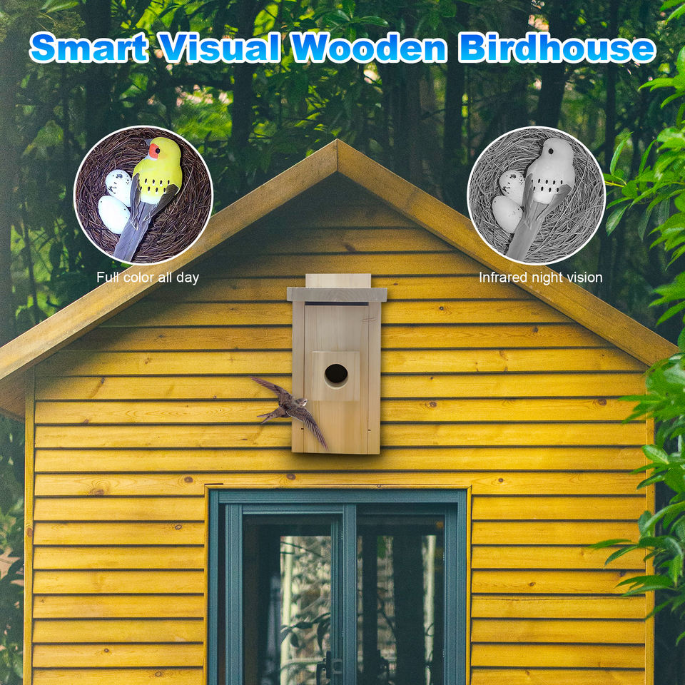 กล้องจดจำนกทันสมัยบ้านนกทำจากไม้กลางแจ้งพร้อมกล้องแบตเตอรี่พลังงานแสงอาทิตย์อุปกรณ์สวน