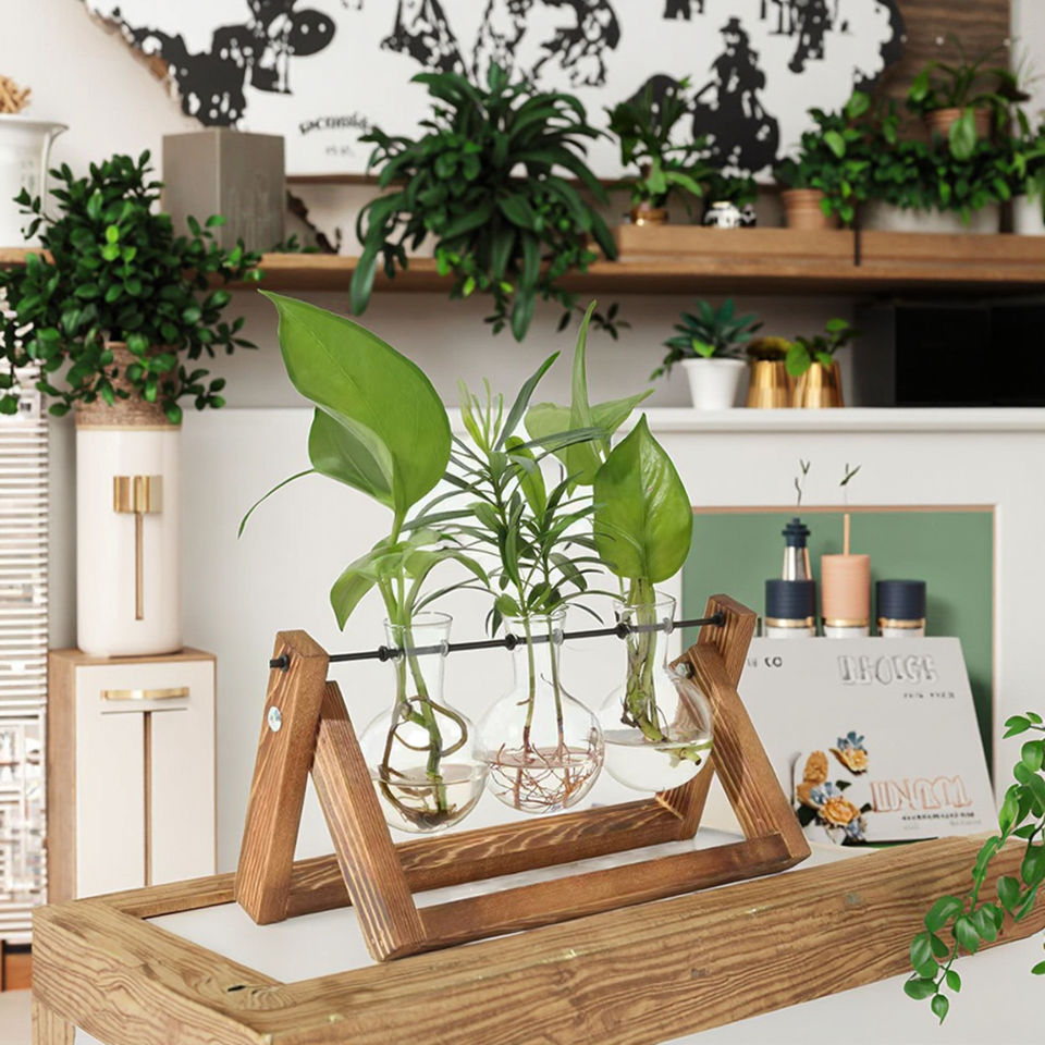 การตกแต่งสำนักงานสไตล์วินเทจที่ทันสมัยเป็นมิตรต่อสิ่งแวดล้อมต้นไม้ไม้ไผ่ที่ทำจากไม้กระถางแก้วแจกัน3หลอดสำหรับสวนในบ้าน