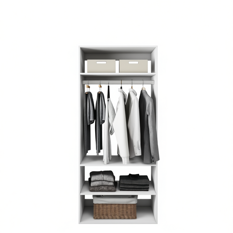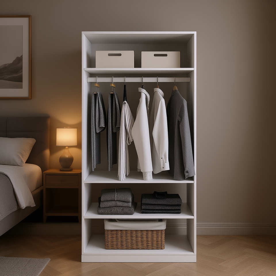 ตู้เสื้อผ้าไม้สีขาวแบบเปิดทันสมัย พร้อมราวแขวนและชั้นวางของสำหรับจัดเก็บในห้องนอน