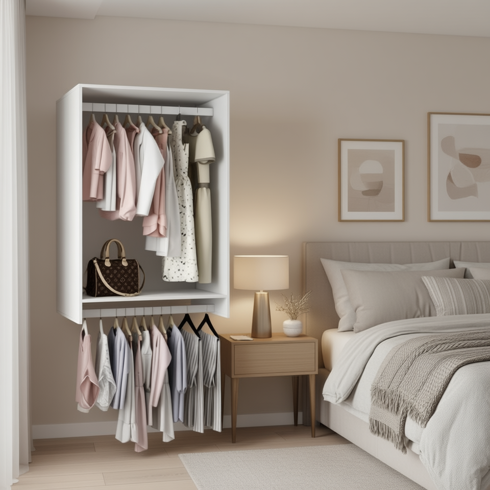 ตู้เสื้อผ้าไม้สีขาวแบบเปิดทันสมัย พร้อมราวแขวนและชั้นวางติดผนัง สำหรับจัดเก็บเสื้อผ้าในห้องนอน