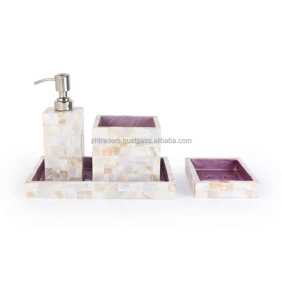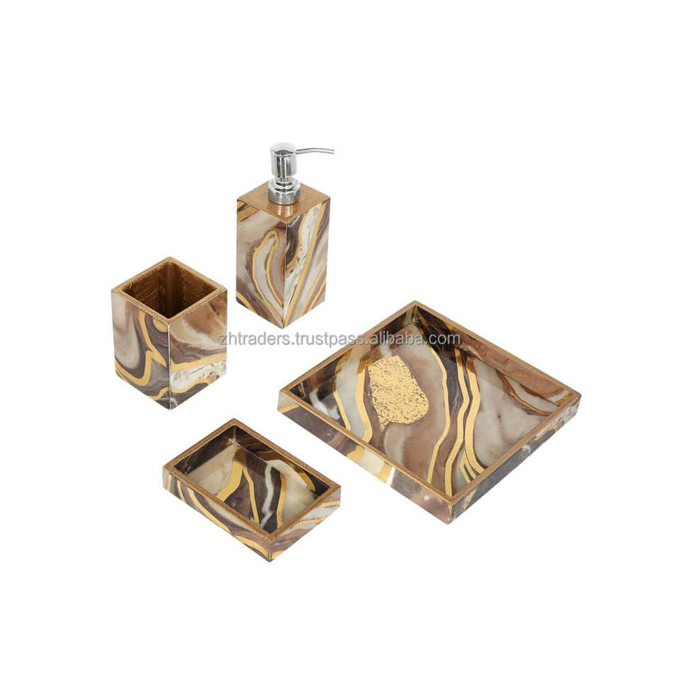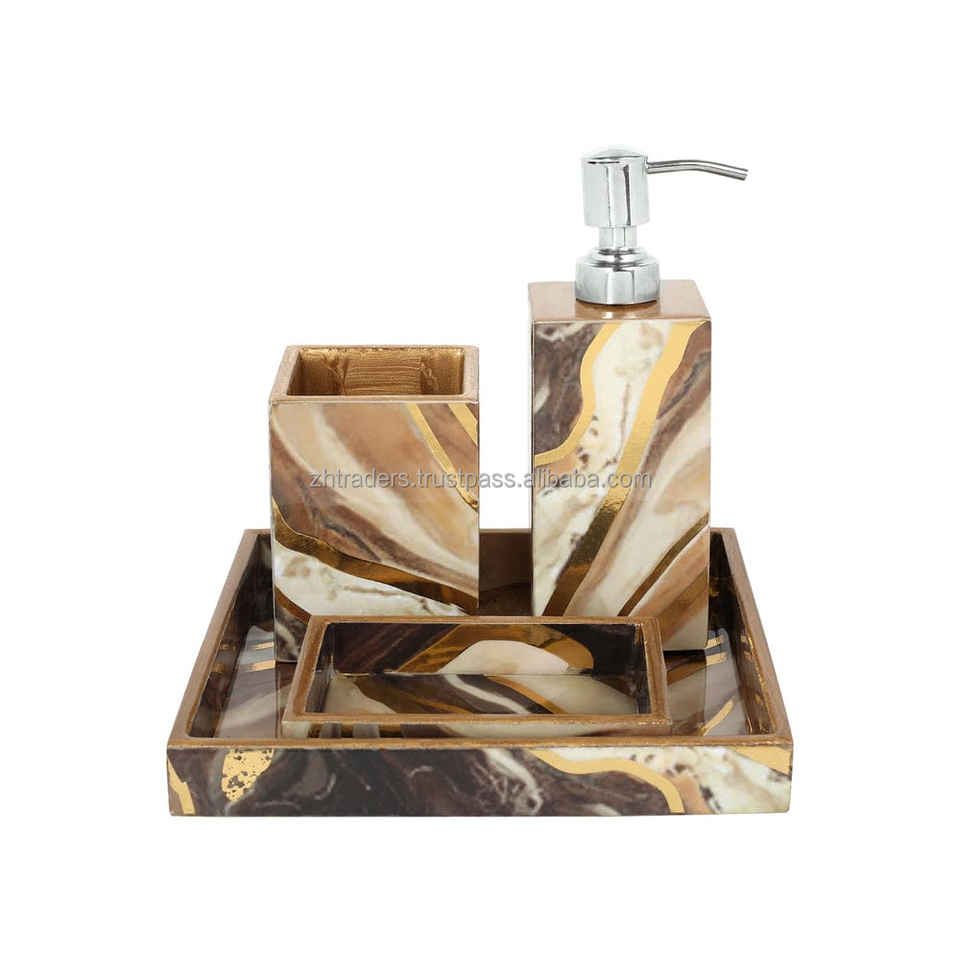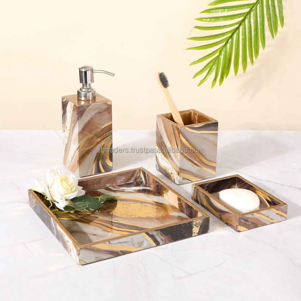 ชุดอุปกรณ์ห้องน้ำทันสมัย ลายพิมพ์เคลือบเงาสีสันสดใส ผลิตจากเรซิ่นกันน้ำ พร้อมที่ปั๊มสบู่ ที่วางแก้วน้ำ และตัวเลือกปรับแต่งได้