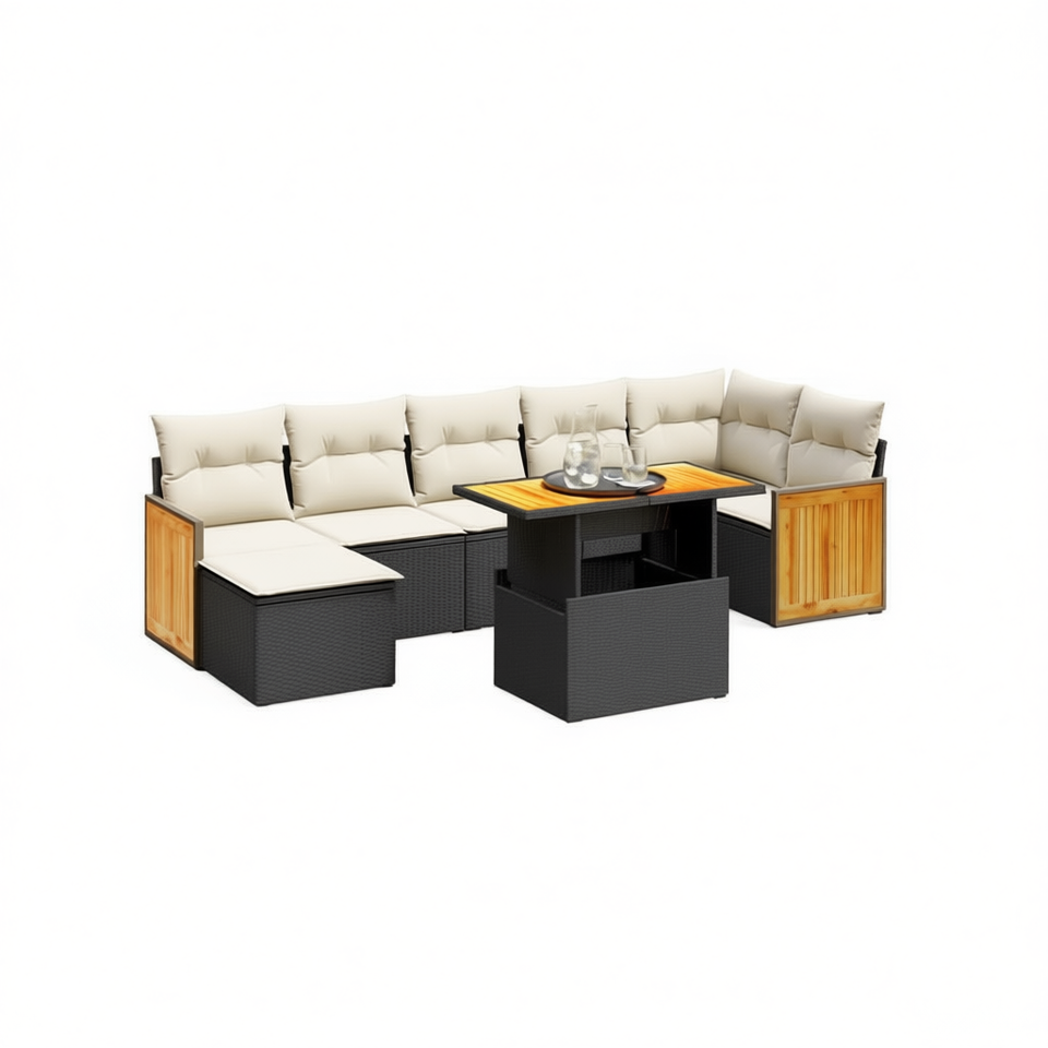 ชุดโซฟาสวนกลางแจ้งทันสมัย 8 ชิ้น หวายสีดำพร้อมเบาะสีครีม ทนทานต่อสภาพอากาศ ดีไซน์ร่วมสมัย