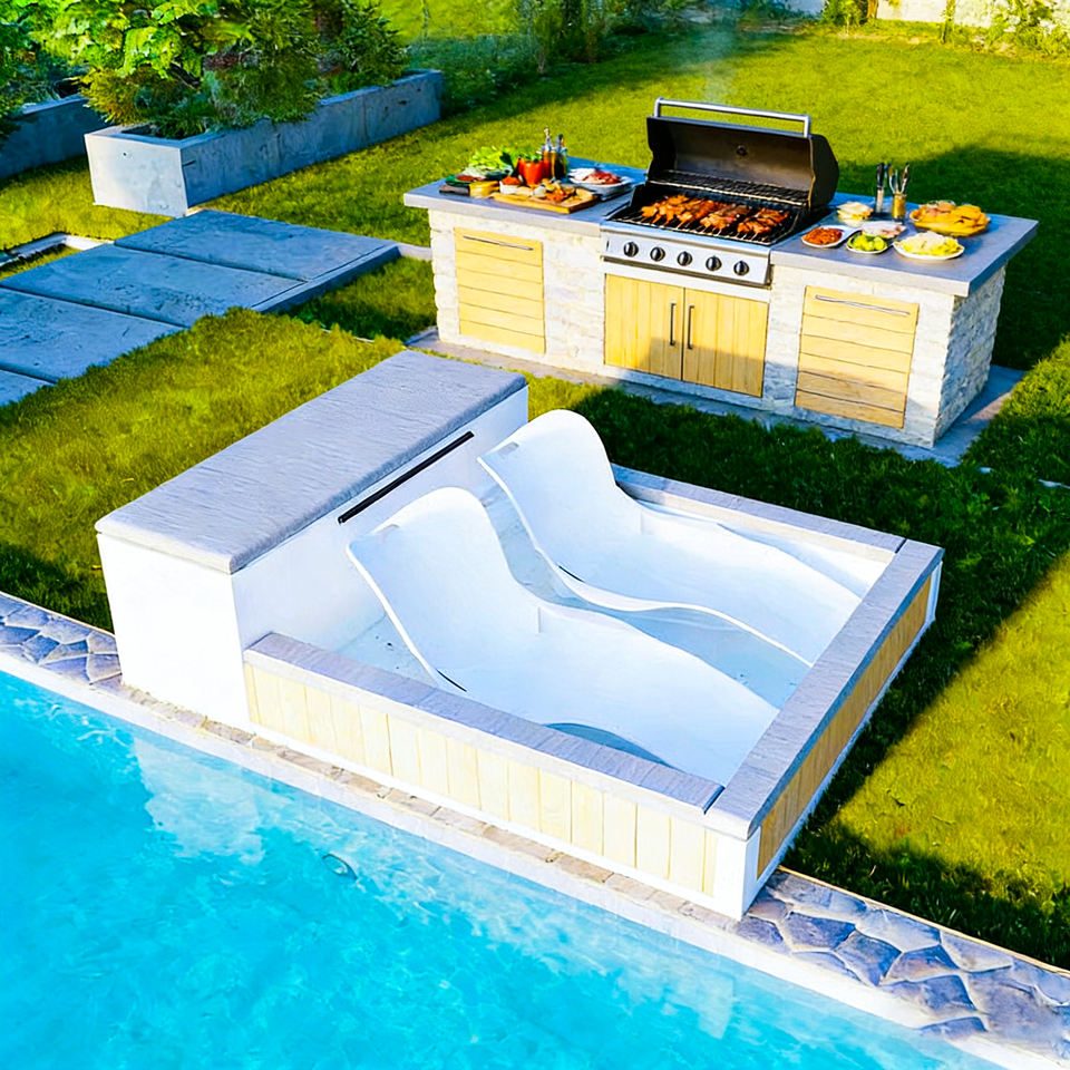 การออกแบบสระว่ายน้ำกลางแจ้งสมัยใหม่พร้อมเตียงนวดน้ำบำบัดเพื่อการผ่อนคลายและความสบาย