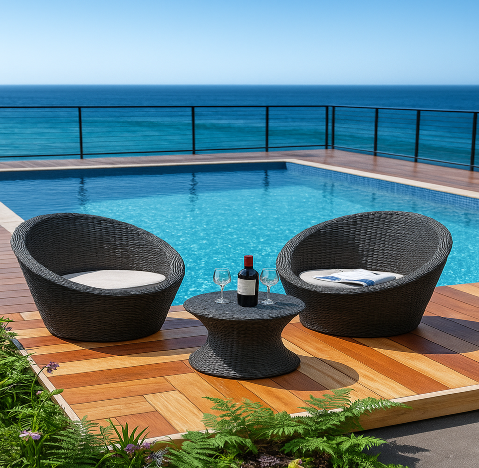 ชุดบิสโทรหวายกลางแจ้งสไตล์โมเดิร์นพร้อมโต๊ะกาแฟและเก้าอี้กันกระแทกระเบียงหรือลานริมสระน้ำ