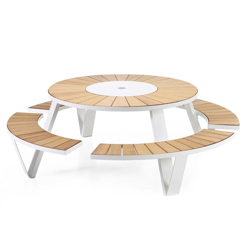 ชุดโต๊ะและเก้าอี้ไม้จริงสแตนเลสสำหรับกลางแจ้งทันสมัย พร้อมร่มในตัว